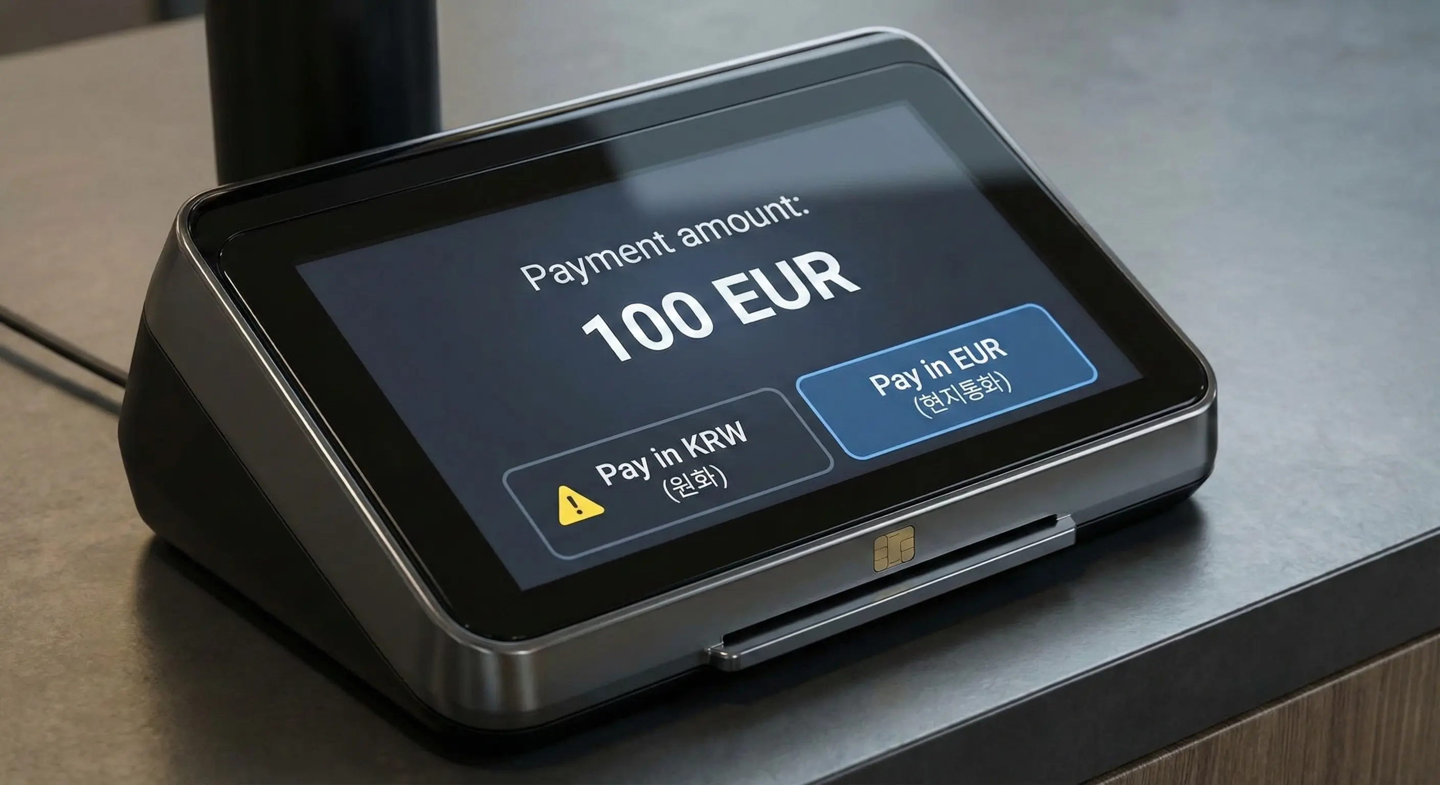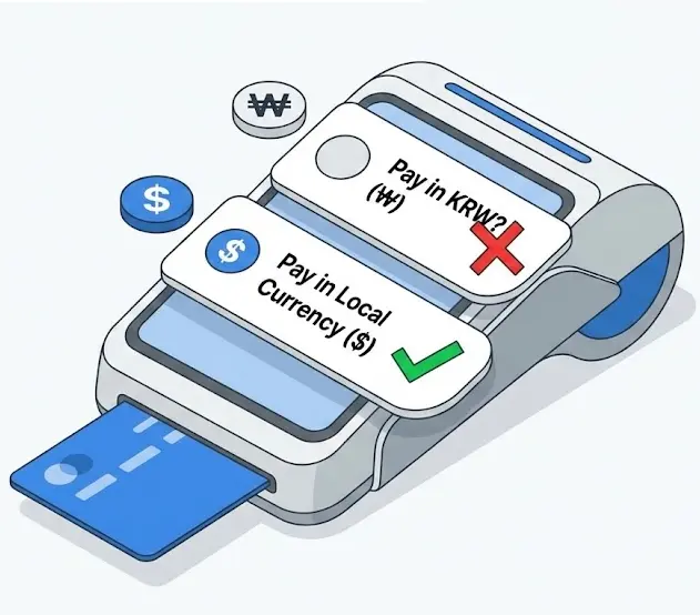 결제 단말기에서 "Pay in Local Currency" 또는 "현지 통화"를 반드시 선택하세요.