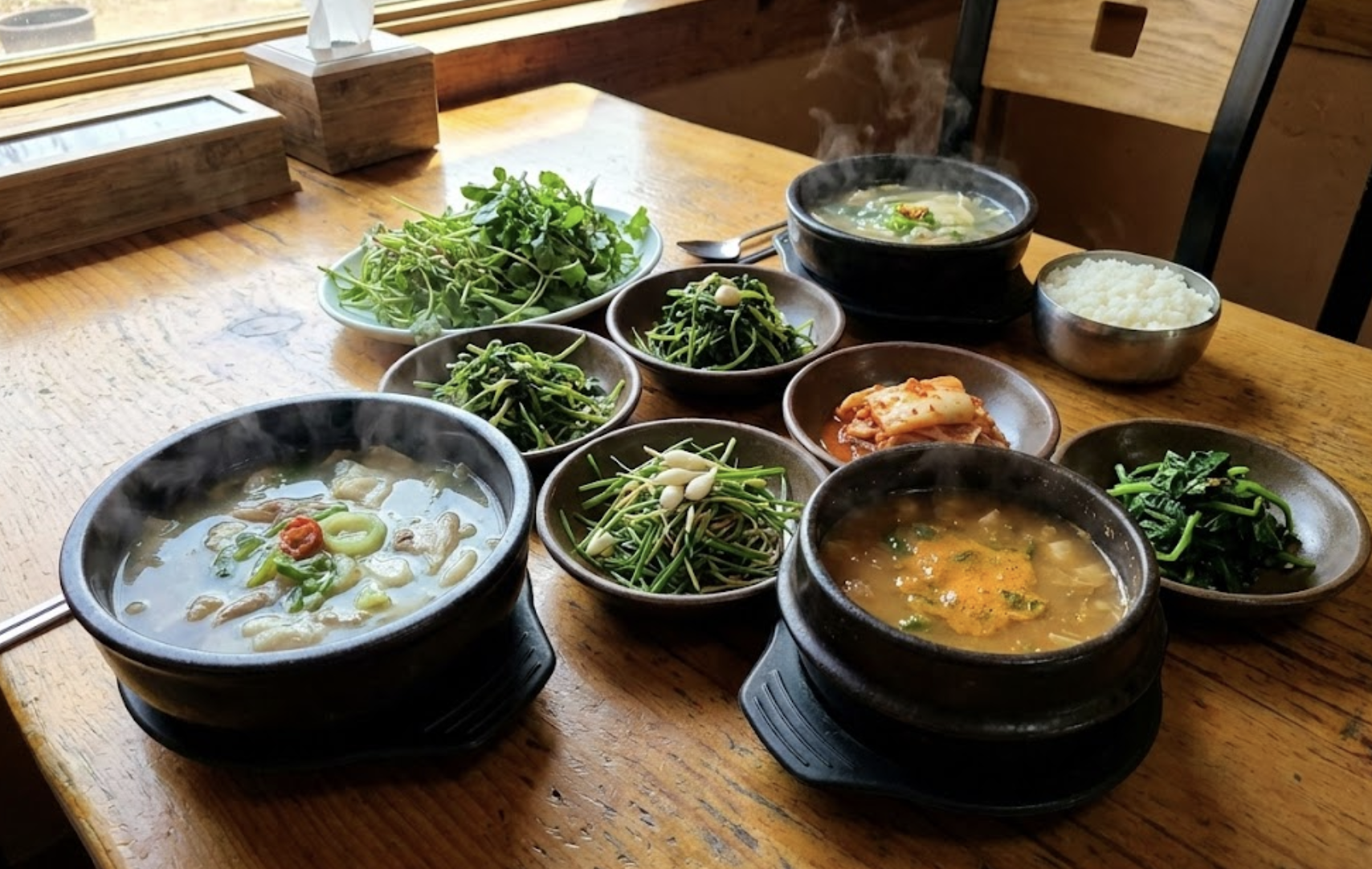 점심은 재첩국이에요. 섬진강과 남해 바닷물이 만나는 하동은 전국 최고의 재첩 산지예요. 황금재첩식당이나 해성식당에서 재첩 스페셜 정식을 시키면 재첩회무침, 재첩부침개, 재첩국, 참게탕까지 한 상 가득 나와요. 특히 3~4월에는 껍데기가 벚꽃 무늬처럼 생긴 벚굴도 맛볼 수 있는데, 섬진강 주변에서만 먹을 수 있는 제철 별미예요.